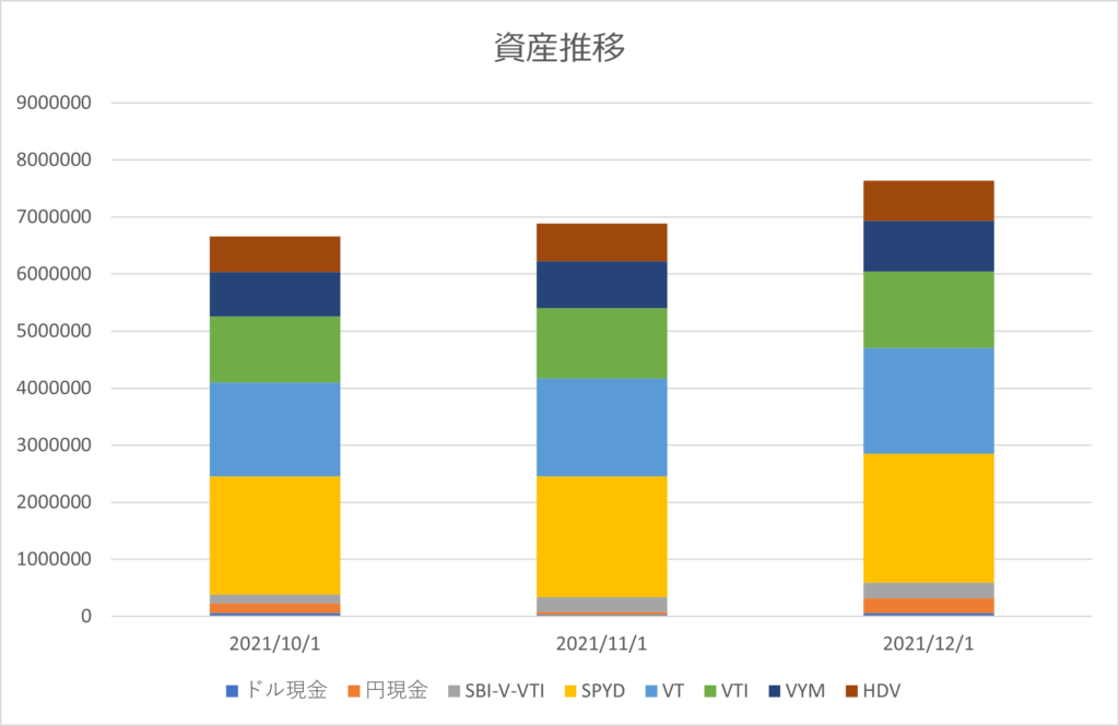 2022年1月15日の資産一覧 資産一覧 Twitter Facebook はてブ Pocket LINE コピー 2022.01.23 目次 資産概要資産一覧資産推移 資産概要 2022年1月15日の資産は約819万円でした。 約半月で55万円程度増えており、ボーナスの残りで現金比率UPしてますね。 比率はほぼ変わらじ、SPYD30%が最大で、VYM・HDVと合わせて高配当ETFが51%となりました。VTI・VTの買い増しを進めてますが、まだまだ比率変更には至らないですね。 資産一覧 資産推移