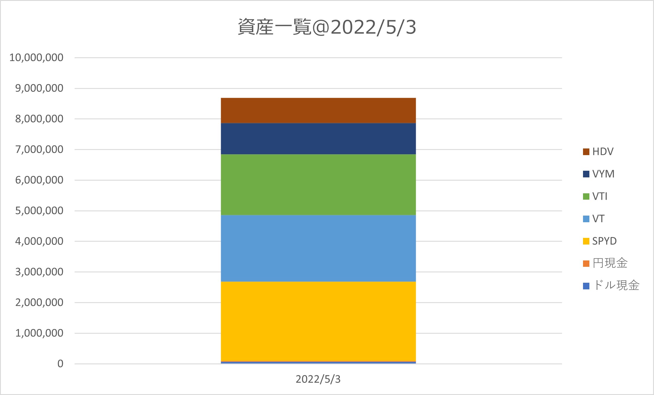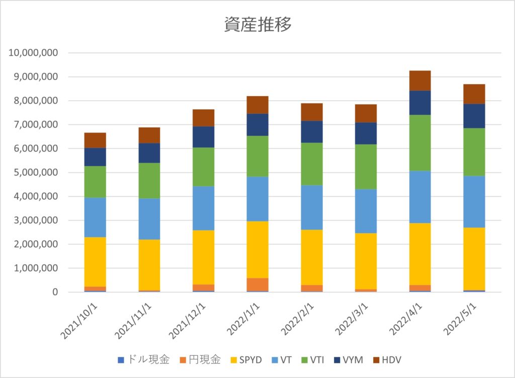 2022年5月の資産一覧 資産一覧 Twitter Facebook はてブ Pocket LINE コピー 2022.05.03 目次 概要資産一覧資産推移 概要 2022年5月3日の資産は約916万円でした。 先月から約10万円程度減りました。VT/VTIの価格が落ちて円安効果を相殺してますね。 比率はVT/VTIの価格が下がったため、VT/VTIで48%となり、SPYDが最大の30%、VYM・HDVと合わせて高配当ETFが51%でした。 資産一覧 資産推移