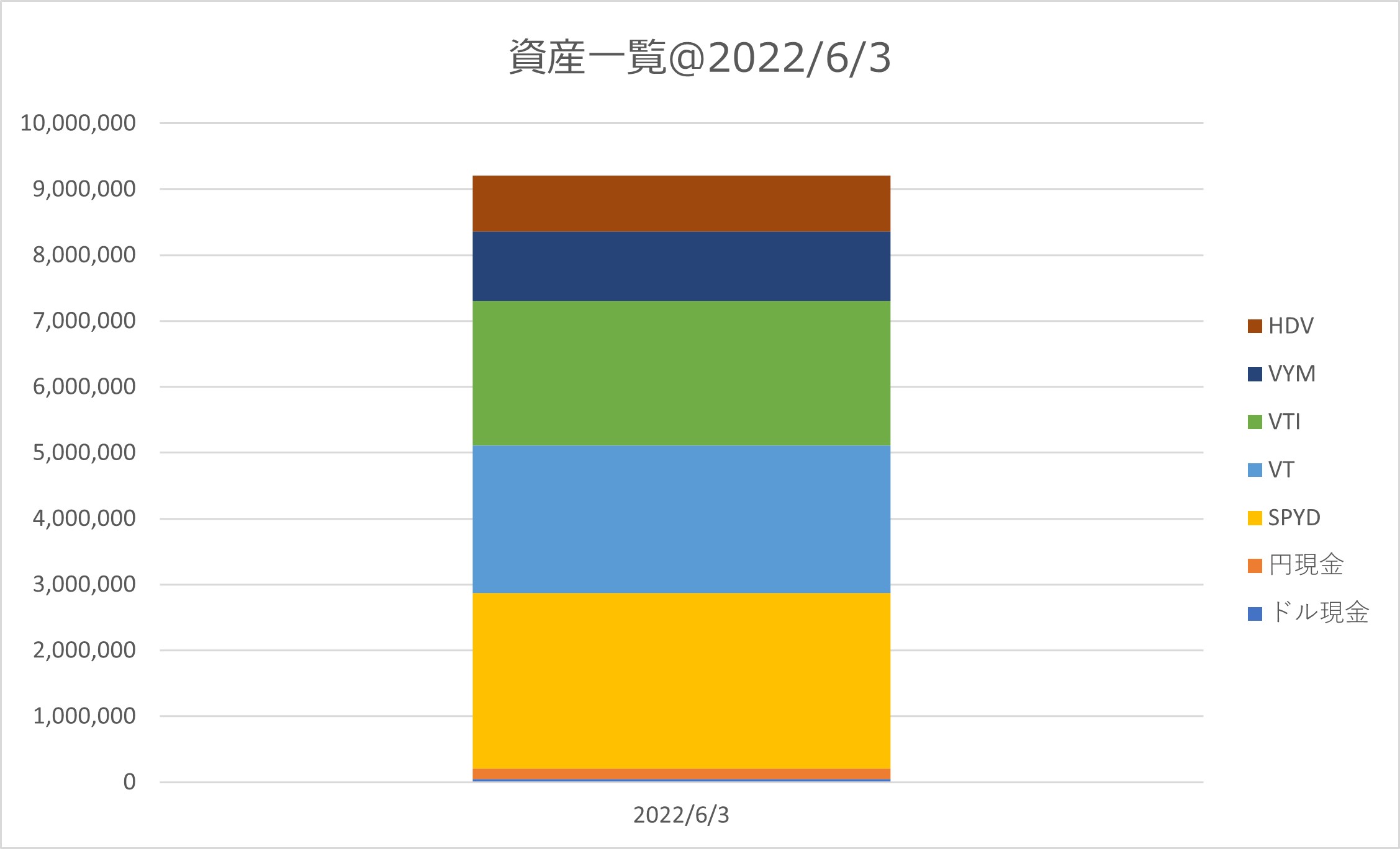 2022年6月3日の資産一覧 資産一覧 Twitter Facebook はてブ Pocket LINE コピー 2022.06.03 目次 概要資産一覧 概要 2022年6月3日の資産は約976万円でした。 先月から約60万円程度増えていますが、ほぼ新規で資金追加している分ですね。ここで株数を増やし、価格上昇局面を迎えたいと思います(いつになるかわかりませんが、、、) 比率は高配当株の株価が頑張ってくれており、SPYDが最大の30%、VYM・HDVと合わせて高配当ETFが50%、VT/VTIが48%でした。VT/VTIを結構買っているはずなのですが、全然増えないですね。 資産一覧